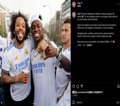 维尼修斯致敬马塞洛:踢边卫的边锋退役了感谢你的建议和责骂