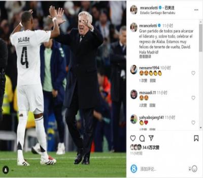 安切洛蒂社媒晒出与阿拉巴的合照,并写道:“大家都踢出了精彩的比赛,帮助球队登顶,最重要的是庆祝阿拉巴的回归。我们很高兴你能回来,大卫。Hala Madrid!”