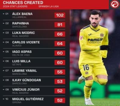 体育资讯12月28日报道宣称 年终岁末,《Squawka》盘点了西甲本年度创造机会top10,比利亚雷亚尔的巴埃纳以102次居首,拉菲尼亚和莫德里奇位居二三位。