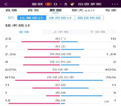 体育资讯12月22日报道宣称 在本轮英超,曼联主场0-3惨败给伯恩茅斯,以下为双方全场数据对比: