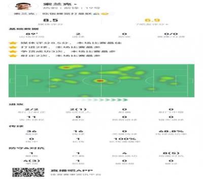 索兰克本场2射进2球12对抗8成功+4抢断获评8.5分全队最高