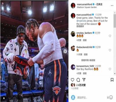 拉什福德在社交媒体上晒出照片,并写道:“精彩的比赛,杰伦(布伦森),谢谢你送给我尼克斯球衣,祝你在本赛季余下的比赛中好运!”
