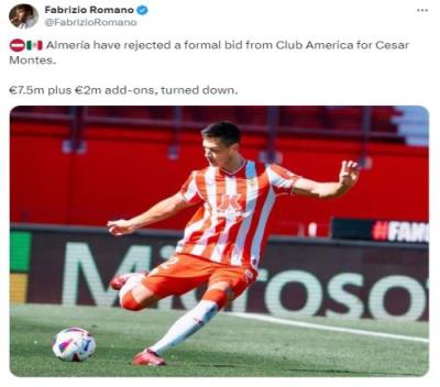 罗马诺写道:“阿尔梅里亚拒绝了墨西哥美洲俱乐部对蒙特斯的正式报价,该报价为750万欧+200万欧附加费用,但是已经被拒绝了。”