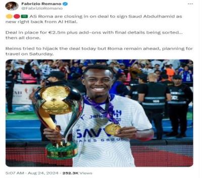 罗马诺:罗马接近从利雅得新月签下右后卫阿卜杜勒哈米德