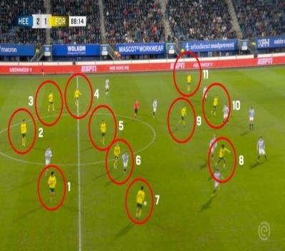 比赛踢到第87分钟,海伦芬还以2-1领先。福图纳队进行了两次换人,但在其中一次换人后,被换下的人没有离开,还是留在了场上。于是场上出现了12vs11的怪异景象。很快,福图纳在场上有12名球员的情况下获得了一个角球,此时裁判才发现问题,让场上恢复为11vs11。而福图纳利用这个角球扳平了比分。