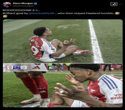 知名枪迷、英国名嘴皮尔斯摩根晒出斯凯利的庆祝照片,并写道:炸裂!斯凯利打进了精彩进球,然后他让哈兰德保持谦逊了。