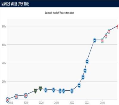 麦卡加盟利物浦后,身价呈现不断上涨趋势,是红军重建中场的重要核心,能踢10号位、8号位、6号位。