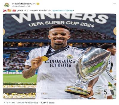 皇马官方社媒晒出米利唐手捧欧超杯奖杯的照片,配文:“生日快乐,米利唐!”