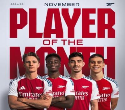 体育资讯12月3日报道宣称 随着11月的赛程全部结束,阿森纳公布了队内月最佳球员的候选人,分别是厄德高、萨卡、哈弗茨和特罗萨德。