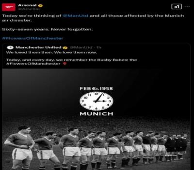 阿森纳写道:今天,我们向曼联和所有受到慕尼黑空难影响的人们致以哀思。六十七年过去了,我们永远不会忘记。