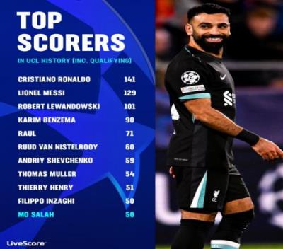 欧冠射手榜:萨拉赫50球并列第10,C罗141球居首,梅西129第2