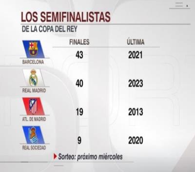 ESPN统计了四支半决赛球队历史上晋级国王杯决赛的次数,巴萨以43次居首,皇马40次第二。