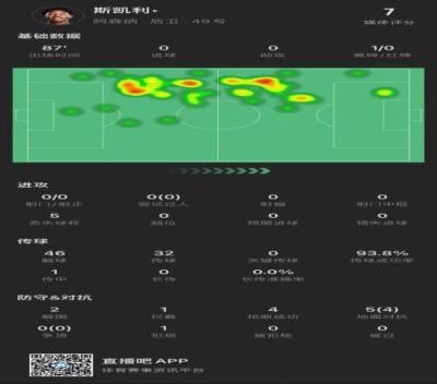 斯凯利本场数据:2解围4抢断4次赢得地面对抗&评分7