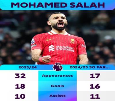 萨拉赫本赛季英超17场16球11助攻,上赛季英超32场18球10助攻。本赛季英超还剩21场(利物浦少赛1场),萨拉赫助攻数已超上赛季,进球数只差2个。