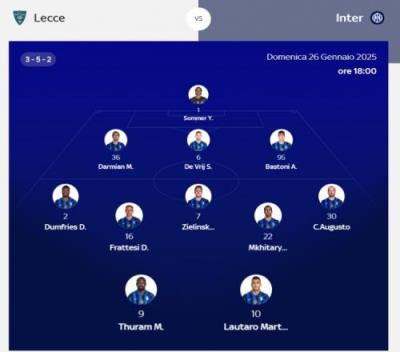 意天空预测国米客战莱切首发:达米安、奥古斯托、泽林斯基出场