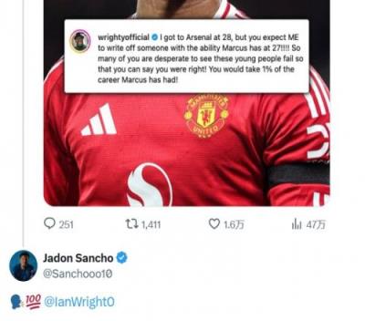 体育资讯12月20日报道宣称 阿森纳名宿伊恩-赖特在近日声援拉什福德,当前被外租的桑乔也进行了点评。