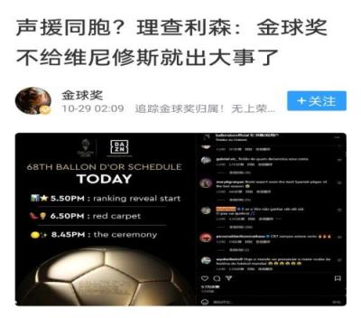 在2024金球典礼夜,理查利森曾在社媒留言:“如果金球奖不给维尼修斯,那就要出事儿了。”而就在那天之后,曼城开启了连败。