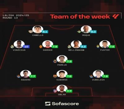 Sofascore西甲第13轮最佳阵:维尼修斯领衔,贝林、库巴西在列