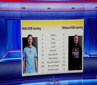 反差巨大!德布劳内本赛季英超首发5场曼城全胜,未首发3胜2平4负