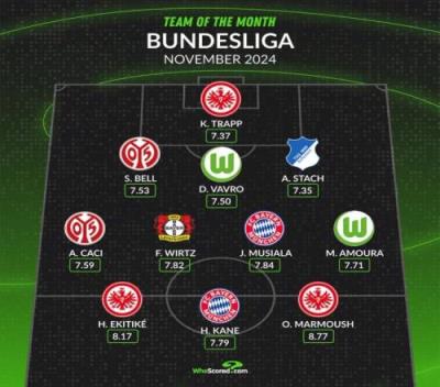 whoscored德甲11月最佳阵:凯恩、马尔穆什领衔,德国双星在列