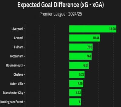 本赛季英超预期净胜球榜: