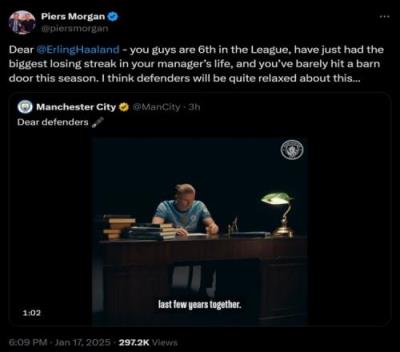 体育资讯1月17日报道宣称 今天,曼城官宣和哈兰德续约至2034年。在官宣视频中,哈兰德给后卫们写了一封信,颇有挑衅意味。不过,知名枪迷、英国名嘴皮尔斯-摩根吐槽了他的行为。