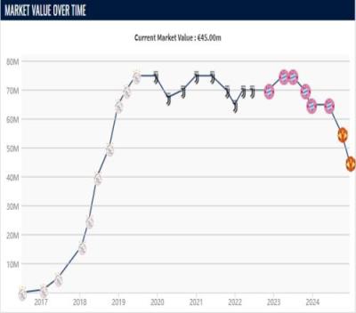 体育资讯12月17日报道宣称 昨日德转更新英超球员身价,曼联中卫德里赫特身价再跌1000万欧,跌至4500万欧。
