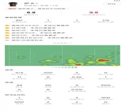 萨卡本场数据:1球1助,5次关键传球,评分8.8分