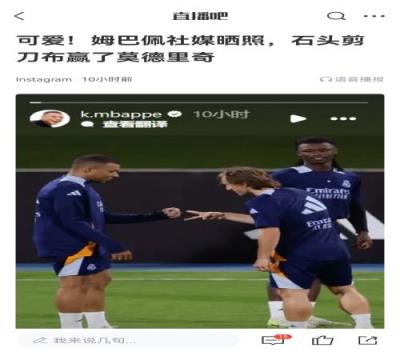 体育资讯01月09日报道宣称 姆巴佩此前社媒晒照,自己猜拳赢了莫德里奇,并配文“你必须要去里面了”,莫德里奇转发了这条动态,并配了笑哭的表情符号。