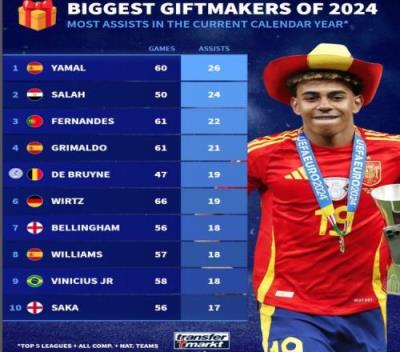 体育资讯12月26日报道宣称 《转会市场》统计了2024年效力五大联赛球员的俱乐部+国家队各项赛事总助攻榜,巴萨小将亚马尔居首。