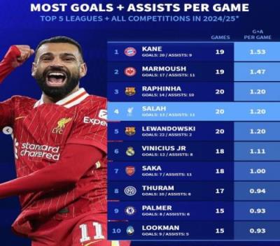 本赛季五大联赛球员各项赛事场均参与进球榜: