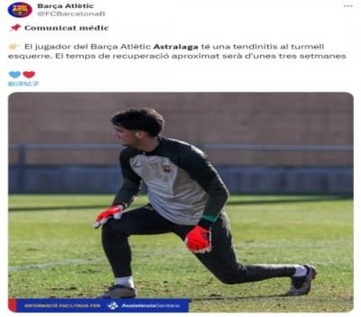 巴萨官方发布医疗公告,确认20岁门将阿斯特拉拉加左脚踝患有肌腱炎,大约需要三周的时间来恢复。