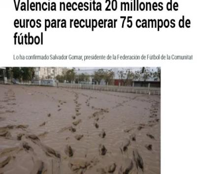 瓦伦西亚足协主席萨尔瓦多-戈马尔表示,在受灾的75个足球场中,20个球场遭到严重破坏,每个修复费用约40万欧元,平均每个球场需要20万欧元。这些球场99%为市政设施,修复工作预计需要6至8个月才能开始。