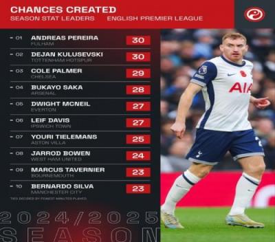 本赛季英超创造机会榜:佩雷拉、库卢30次居首,帕尔默29次第三