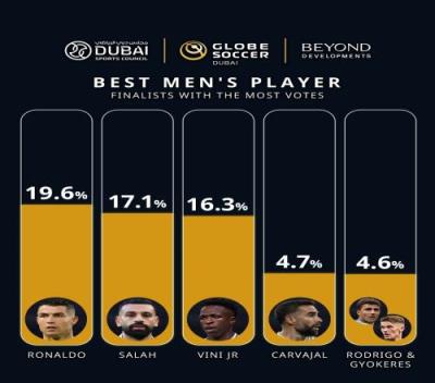 环足奖官方公布最佳球员目前获票情况:C罗19.6%领跑,萨拉赫第二