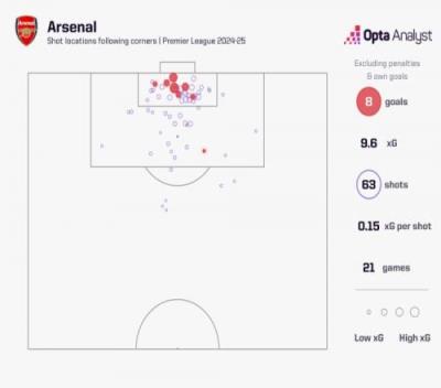 据opta统计,算上乌龙球,阿森纳本赛季已经通过角球打进10球,英超中没有其他球队能做到这一点。