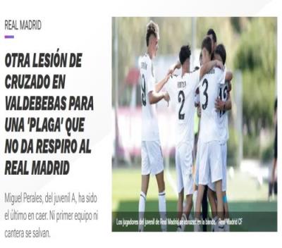 体育资讯12月16日报道宣称 西班牙媒体relevo报道,皇马U19的18岁后卫米格尔-佩拉莱斯遭遇膝盖十字韧带重伤,赛季报销。