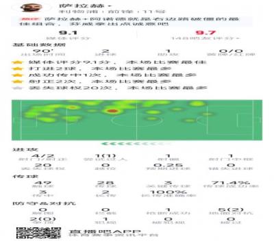 萨拉赫本场数据:2射1传,4射2正,1次中框,3次关键传球