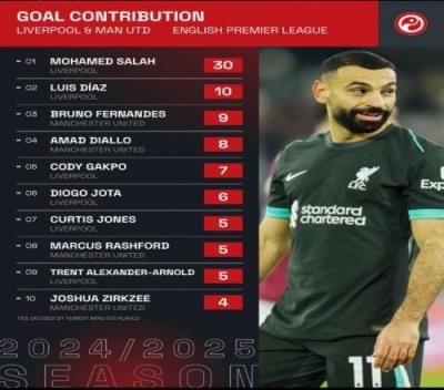 利物浦&曼联球员本赛季英超参与进球榜:萨拉赫30球居首,B费9球