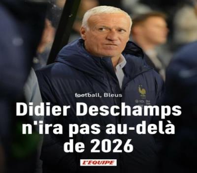 德尚与法国队合同2026年到期,世界杯结束后他不会再续约。据悉,德尚将于周三下午1点接受TF1采访时宣布这一消息。56岁德尚几个月前就已做出了决定,他认为现在是时候结束关于他未来的讨论了。