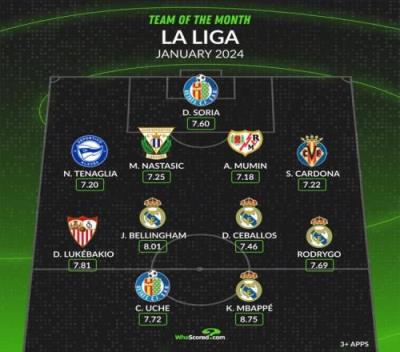体育资讯2月4日报道宣称 whoscored统计了西甲1月的评分最佳阵,姆巴佩、贝林厄姆领衔。
