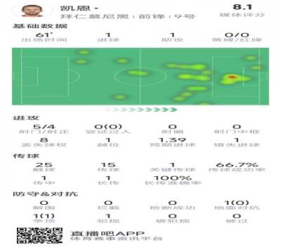 凯恩全场数据:传射建功,5次射门4次射正,评分8.1分