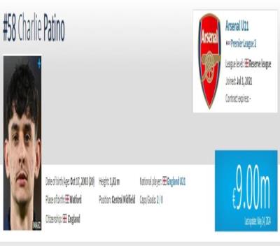 据记者罗马诺报道,阿森纳20岁小将帕蒂诺即将加盟西乙球队拉科鲁尼亚,转会费100万镑(120万欧)+二转分成,而帕蒂诺的身价则为900万欧。