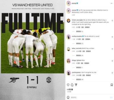 体育资讯1月13日报道宣称 本轮足总杯,曼联120分钟1-1战平阿森纳,点球大战取胜。赛后,阿森纳的社媒战报又一次被大量负面评论刷屏。