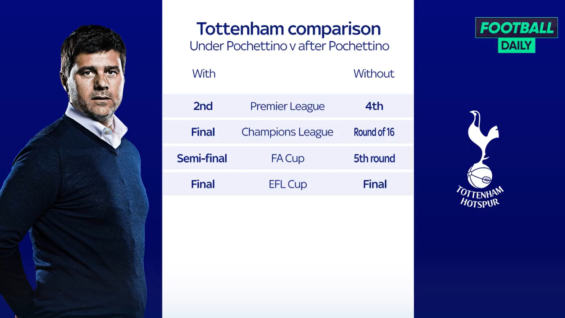 4月25日讯 英国媒体Football Daily统计了波切蒂诺在任和离任之后热刺的成绩,并作出对比。