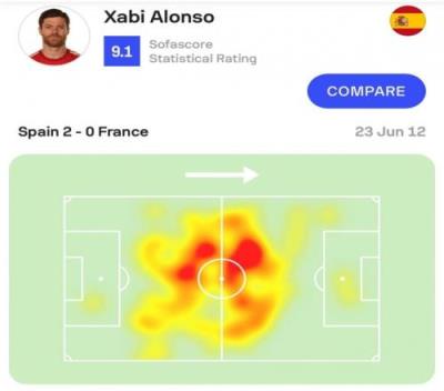 西班牙与法国上一次欧洲杯交锋是在2012年的1/4决赛中,现任勒沃库森主帅哈维-阿隆索为西班牙梅开二度,帮助球队2-0击败法国,最终西班牙捧起了那届赛事的冠军奖杯。Sofascore统计了哈维-阿隆索那场比赛的数据。