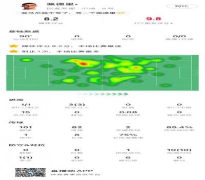 触球101次,传球82次,传球成功率85.4%,2次关键传球