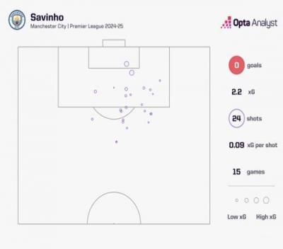 体育资讯12月26日报道宣称 在英超第18轮比赛中,萨维尼奥为曼城首发出战,曼城上半场1-1战平埃弗顿,据Opta统计,在本赛季英超未进球的球员中,萨维尼奥射门次数最多。