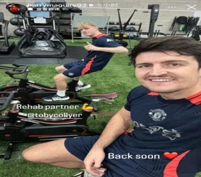 马奎尔晒出自己和小将科利尔一起在健身房进行锻炼的自拍照,并写道:@科利尔,康复搭档。很快回来❤”
