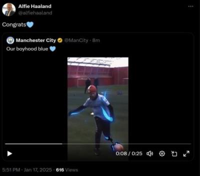 曼城官方晒出了哈兰德小时候身穿曼城球衣练球的视频,阿尔菲-哈兰德转发并写道:祝贺。
